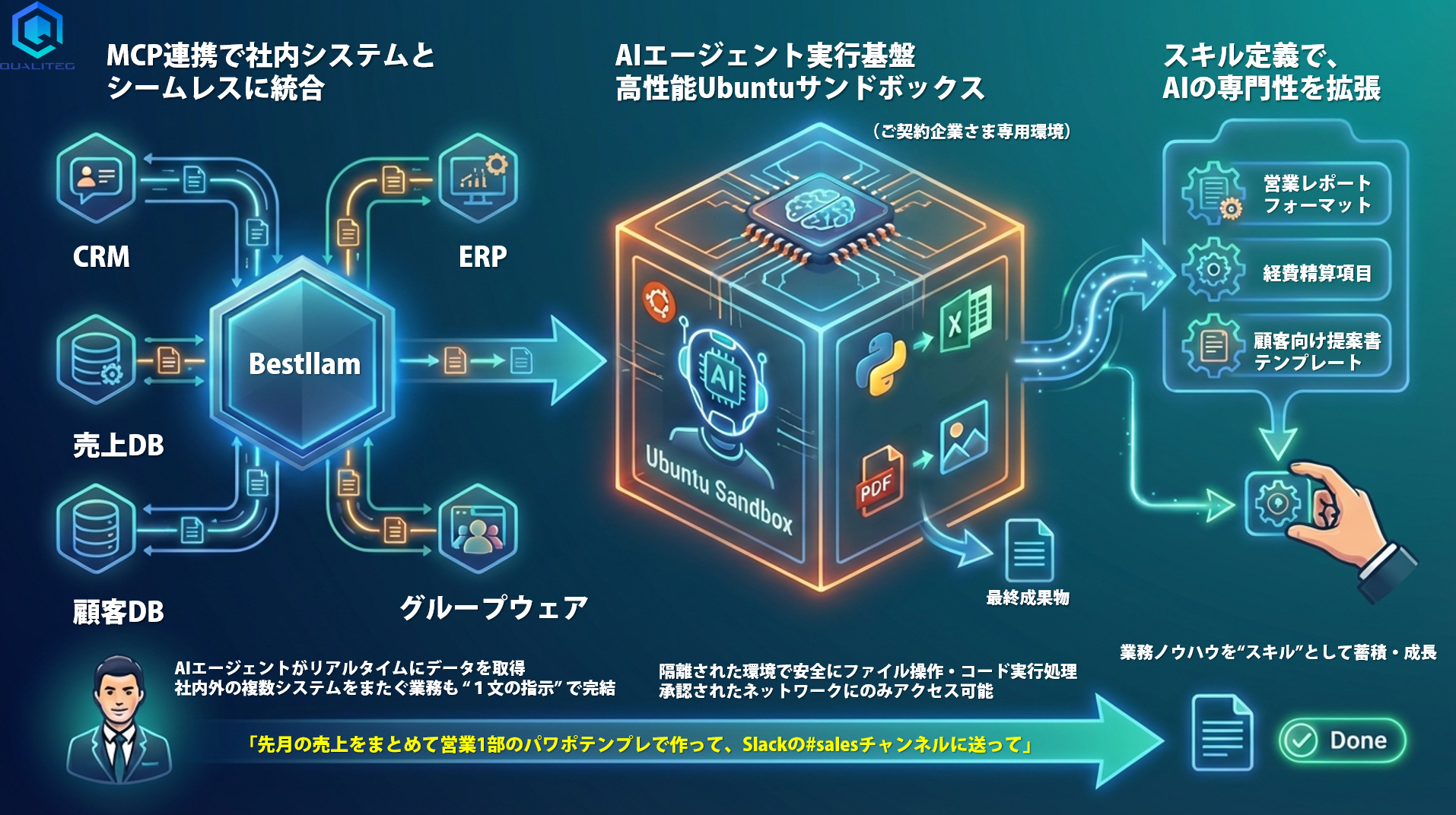 AIエージェントの自律遂行を支えるのが、MCP(Model Context Protocol)による社内システムとの深い統合です。CRM、ERP、データベース、グループウェアなど、既存の業務システムをMCPコネクタで接続することで、AIエージェントがリアルタイムにデータを取得・更新できるようになります。ユーザーが「売上データをまとめて」と指示すると、AIエージェントはMCP経由でデータベースに直接アクセスし、必要な情報を取得。複数システムをまたぐ業務も、Bestllamへの一言で完結します。